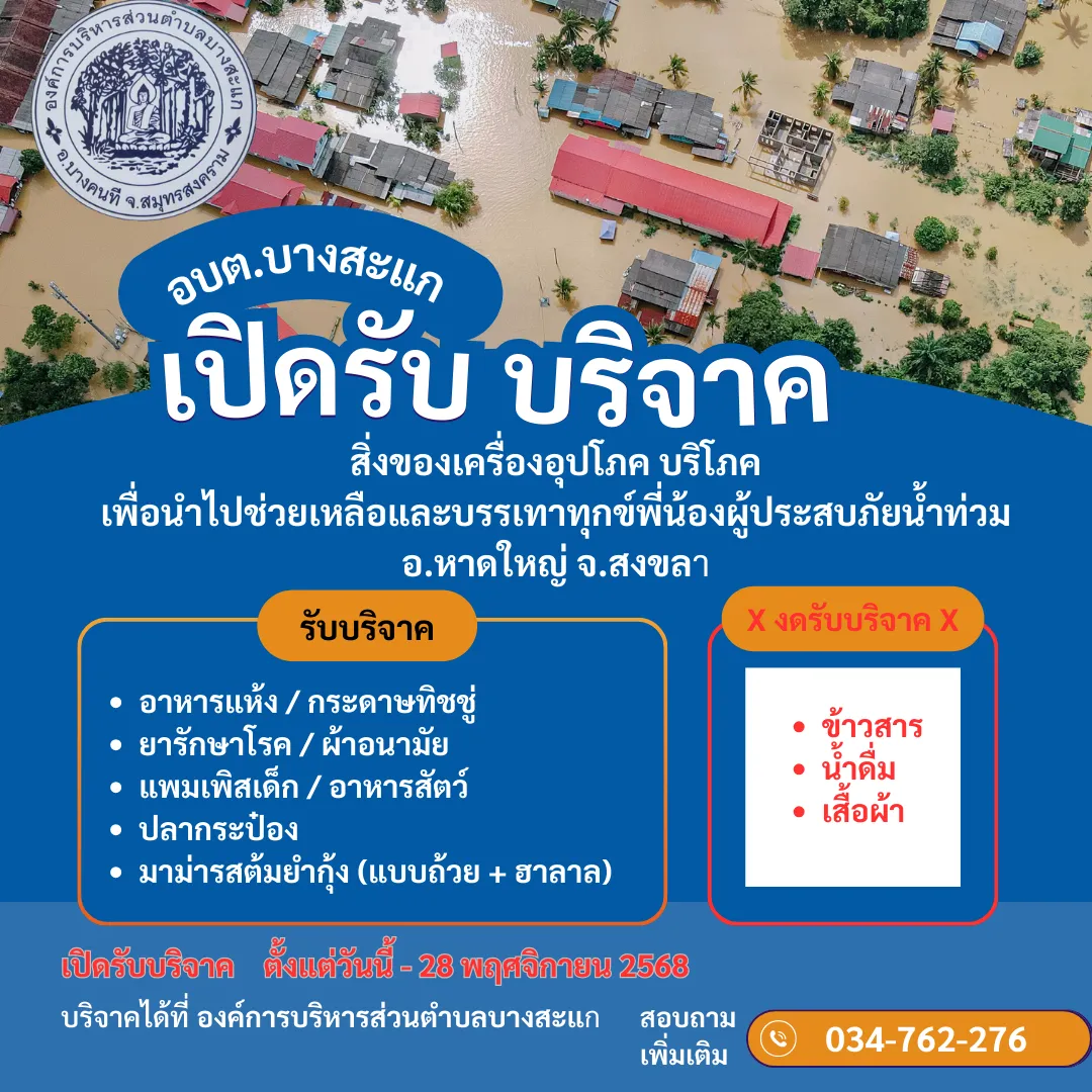 ข่าวประชาสัมพันธ์ องค์การบริหารส่วนตำบลบางสะแก เปิดรับบริจาคสิ่งของเครื่องอุปโภค บริโภค เพื่อนำไปช่วยเหลือและบรรเทาทุกข์พี่น้องผู้ประสบภัยน้ำท่วม อ.หาดใหญ่ จ.สงขลา