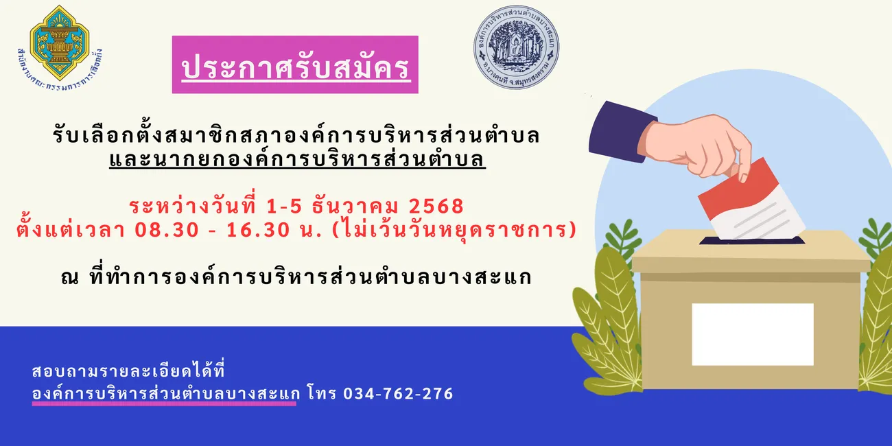 ประกาศรับสมัครรับเลือกตั้งสมาชิกสภาองค์การบริหารส่วนตำบล และนากยกองค์การบริหารส่วนตำบล ระหว่างวันที่ 1-5 ธันวาคม 2568