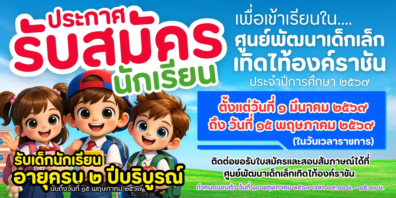 ประชาสัมพันธ์จากองค์การบริหารส่วนตำบลบางสะแก รับสมัครนักเรียน เพื่อเข้าเรียนในศูนย์พัฒนาเด็กเล็กเทิดไท้องค์ราชัน ตำบลบ้านปราโมทย์ ประจำปีการศึกษา 2569