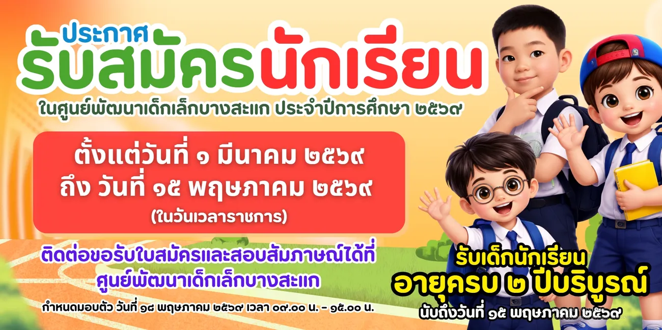 ประชาสัมพันธ์จากองค์การบริหารส่วนตำบลบางสะแก รับสมัครนักเรียน เพื่อเข้าเรียนในศูนย์พัฒนาเด็กเล็กบางสะแก ประจำปีการศึกษา 2569